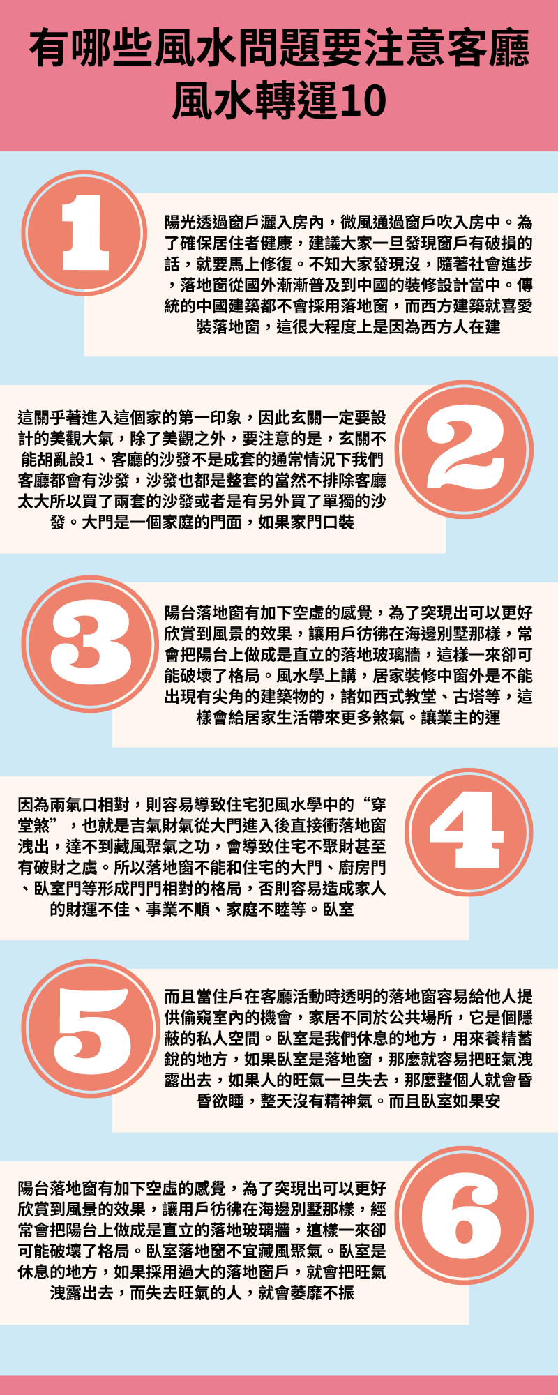 並且客廳安裝落地窗很形成光煞,居住戶主精神和運勢會造成一些負面影響。對五行上屬火業主,會使其性情變得躁動。