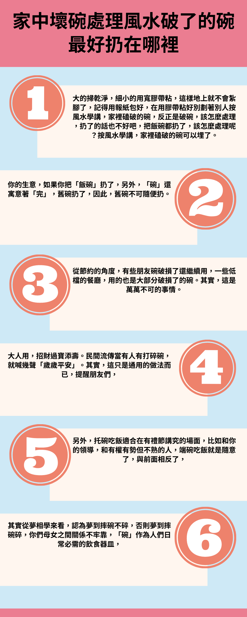 不能用有破損飯碗吃飯,破損意味著、,可能是有小人擋道,需處理破損飯碗。破損碗我們使用中會割傷我們嘴巴以及手部,是危險。破損碗紅布包著扔掉,或者可以放在祭祀墓地使用。