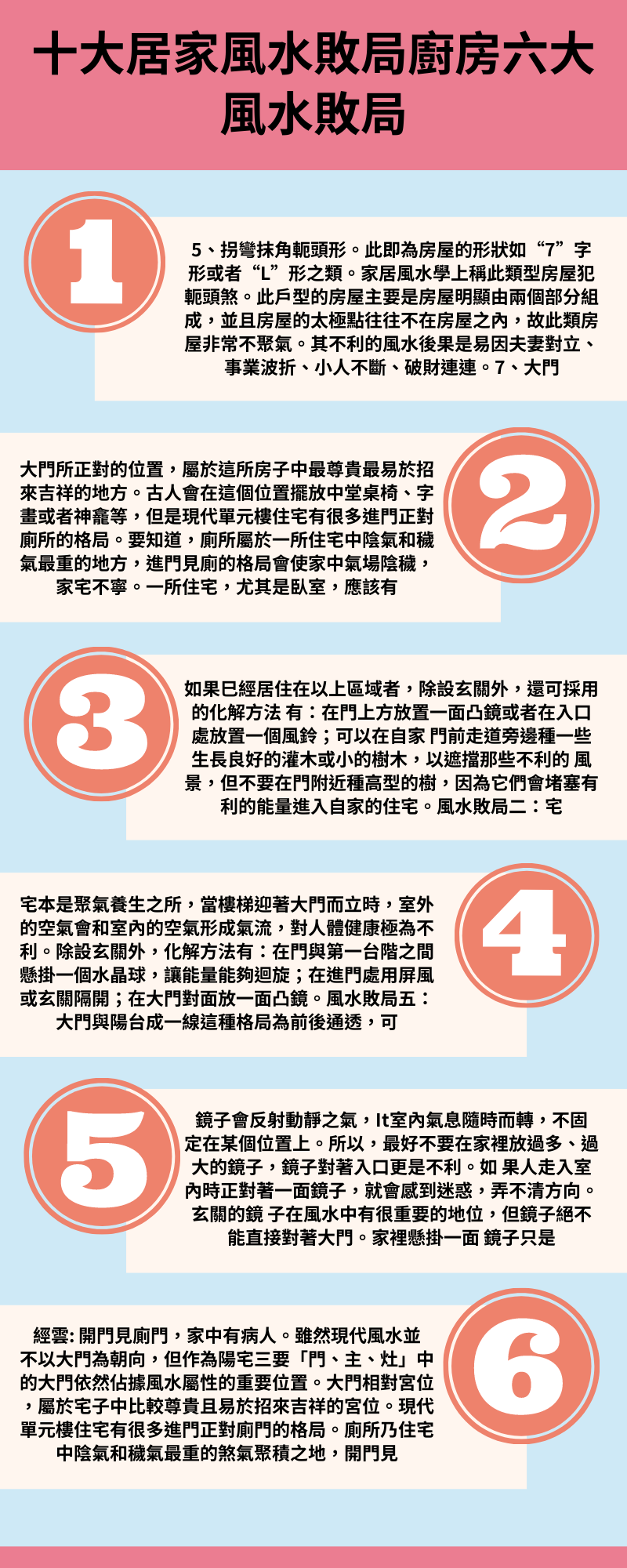 風水學上看,現城市中高樓,10戶可能11戶會存在風水佈局合理問題,多只會於一點和一點說,但決對沒完全符合風水。一些住宅外環境中會遇到情形外,內部各個功能區之間有一些關係需要改善。下面列出了十種風水敗局情況,需要家中設置一些物件來化解。