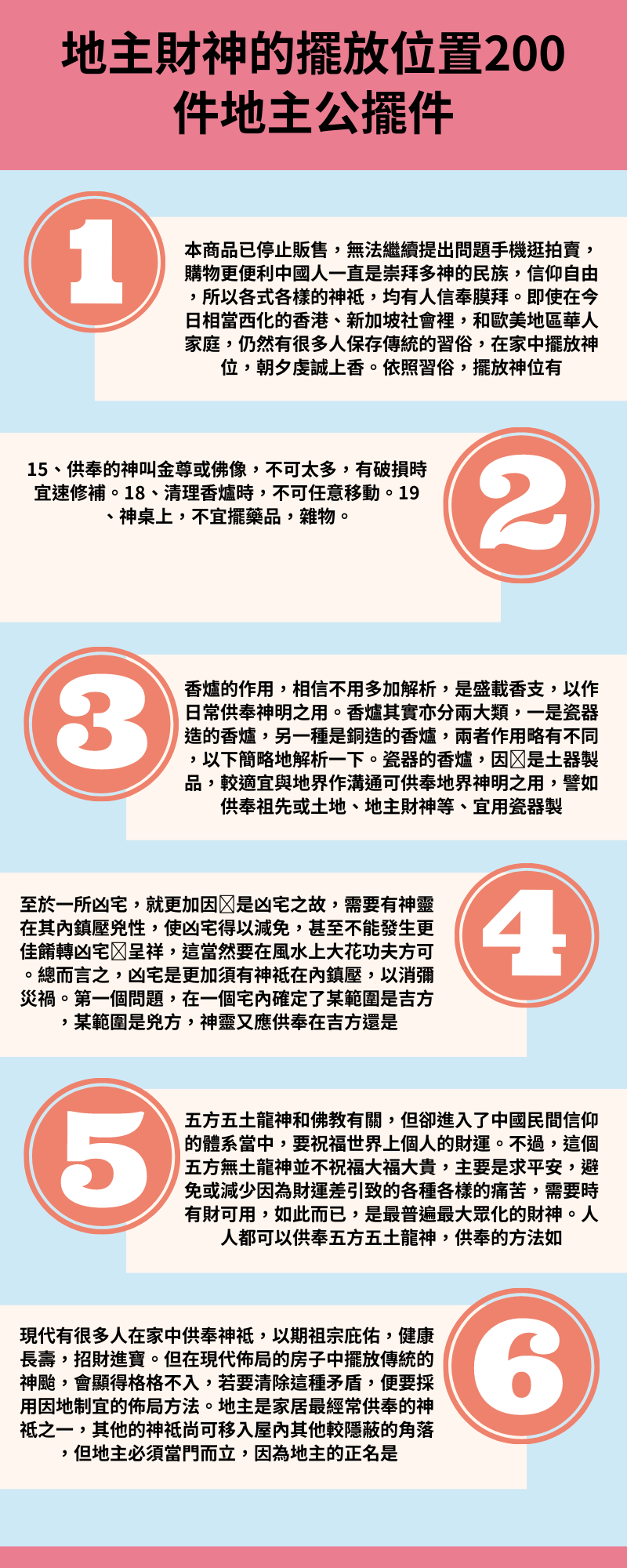 人人可以供奉五方五土龍神,供奉方法如下:於五方五土龍神是地主財神,佔據空間是地下,所以擺放地主財神神位時,是不能夠懸空,這樣離開了他自己大本營,不能得到地利。所以,地上財神神位,放在哪個方位還是次要,首要是要放在地面上。