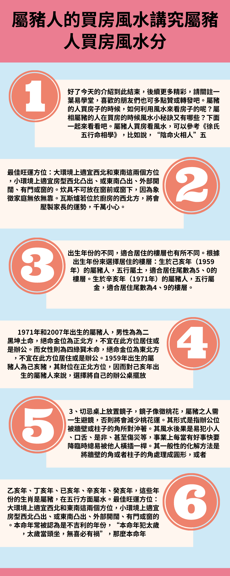 而乙亥年、丁亥年、亥年、辛亥年、癸亥年,這些年份生肖是屬豬,五行方面屬水。最佳運方位:大環境上西北和東南這兩個方位,小環境上房型西北凸出、或東南凸出、外部開闊、有門或窗。最佳購房時間:選擇虎年、兔年、羊年。避開:蛇年、猴年。最佳房屋朝向:選擇東北(偏東)、正東、西南(偏南)。避開:東南(偏南)、西南(偏西)。
