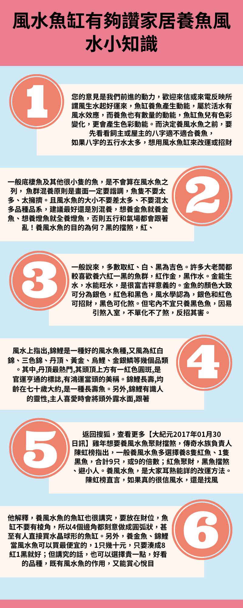 風水魚不外乎招財鎮宅。紅色魚主招財進寶,如紅龍、血鸚鵡、紅色金魚;黑色魚主鎮宅擋煞,如虎頭鯊、黑色金魚。而擺放方位飼養魚兒數量,和飼主生辰八字有關,需請專業堪輿師父到場堪輿!