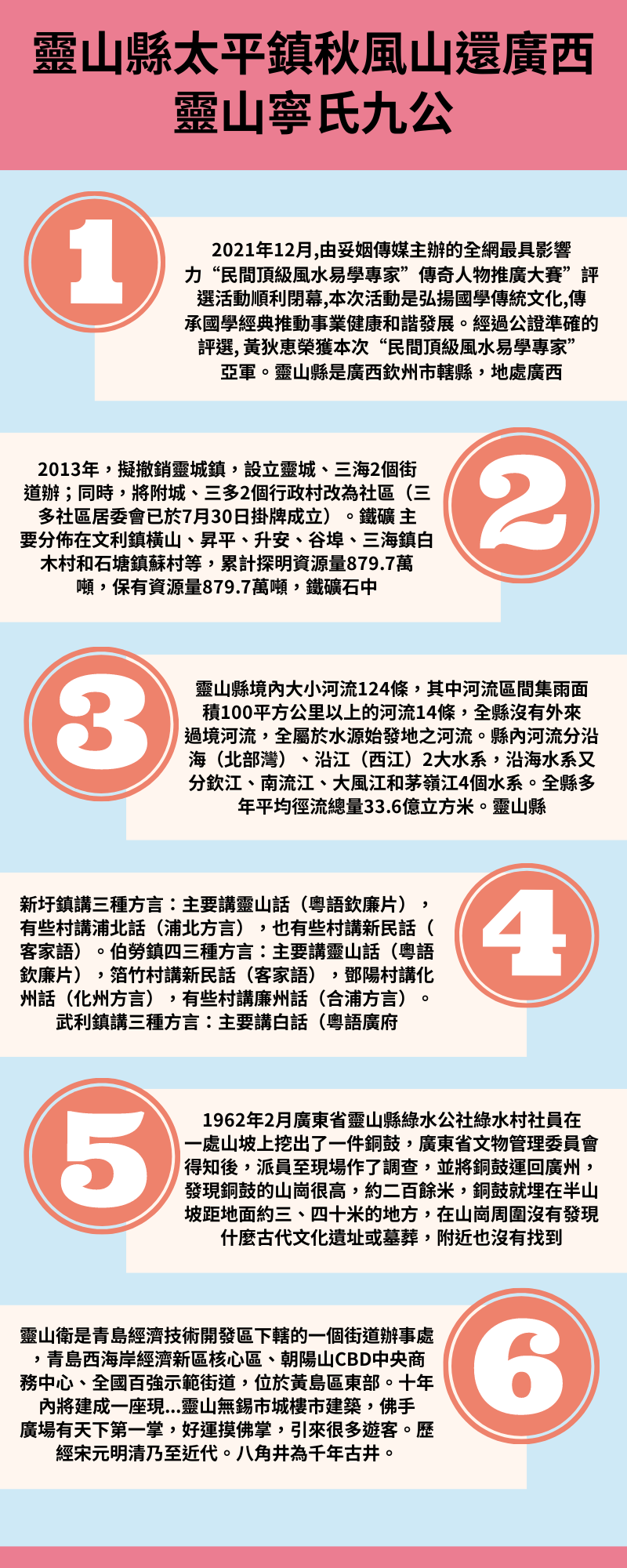靈山縣是廣西欽州市轄縣,地處西南部,欽州市東北部,瀕臨北部灣,鄰近南寧、北海。是泛北部灣經濟區次中心以及是欽州副中心城市。縣城南寧市、欽州市、北海市、防城港市、玉林市、貴港市100多公里,六市形成了1個半時經濟圈,廣州市500公里。是中國荔枝之鄉、中國奶水牛之鄉、中國養蛇鄉、中國名茶之鄉、此外靈山縣是負盛名水果之鄉,水產鄉和魚米鄉。靈山縣位於廣西南部欽州灣畔,地處欽江上游,廣西北部灣經濟區沿海核心工業城市–欽州市東北部,北臨南寧市橫縣,南接北海市合浦縣,東鄰浦北縣,西連欽南、欽北區,靈山縣歷史,隋開皇十八年(公元598年)始置南賓縣,唐貞元十年(公元794年)易名靈山縣,縣治有西靈山(今稱六峰山)而得名。原屬廣東省,1965年劃入廣西,現屬欽州市。
